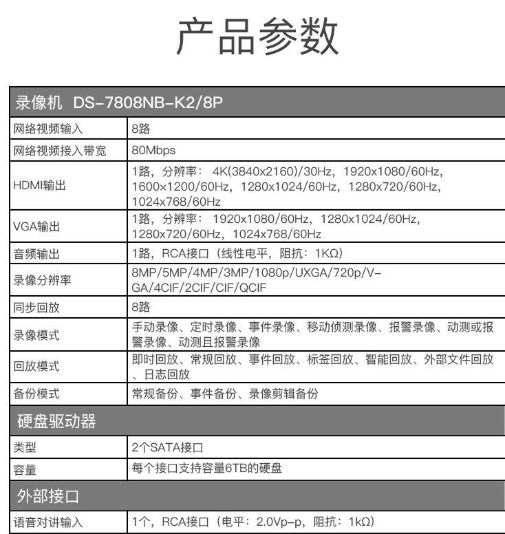 海康威视网络监控硬盘录像机 8路2盘位带网线供电 H.265编码 高清监控录像机 DS-7808NB-K2/8P