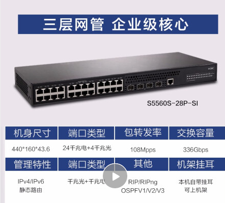 华三(H3C)S5560S-28P-SI 24千兆电口+4千兆光三层网管企业级核心网络交换机